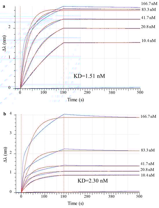 24. Bates, T.A.; Gurmessa, S.K.; Weinstein, J.B.; Trank-Greene, M.; Wrynla, X.H.; Anastas, A.; Anley, T.W.; Hinchliff, A.; Shinde, U.; Burke, J.E.; et al. Biolayer interferometry for measuring the kinetics of protein–protein interactions and nanobody binding. Nat. Protoc. 2025, 20, 861–883. [Google Scholar] [CrossRef]
