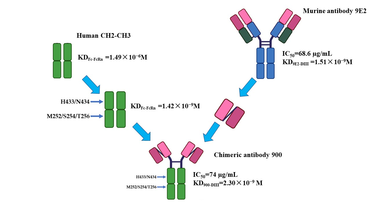 These findings demonstrate that the strategic introduction of mutations into both critical Fc fragment clusters of mAb 900 substantially enhanced its affinity for FcRn.