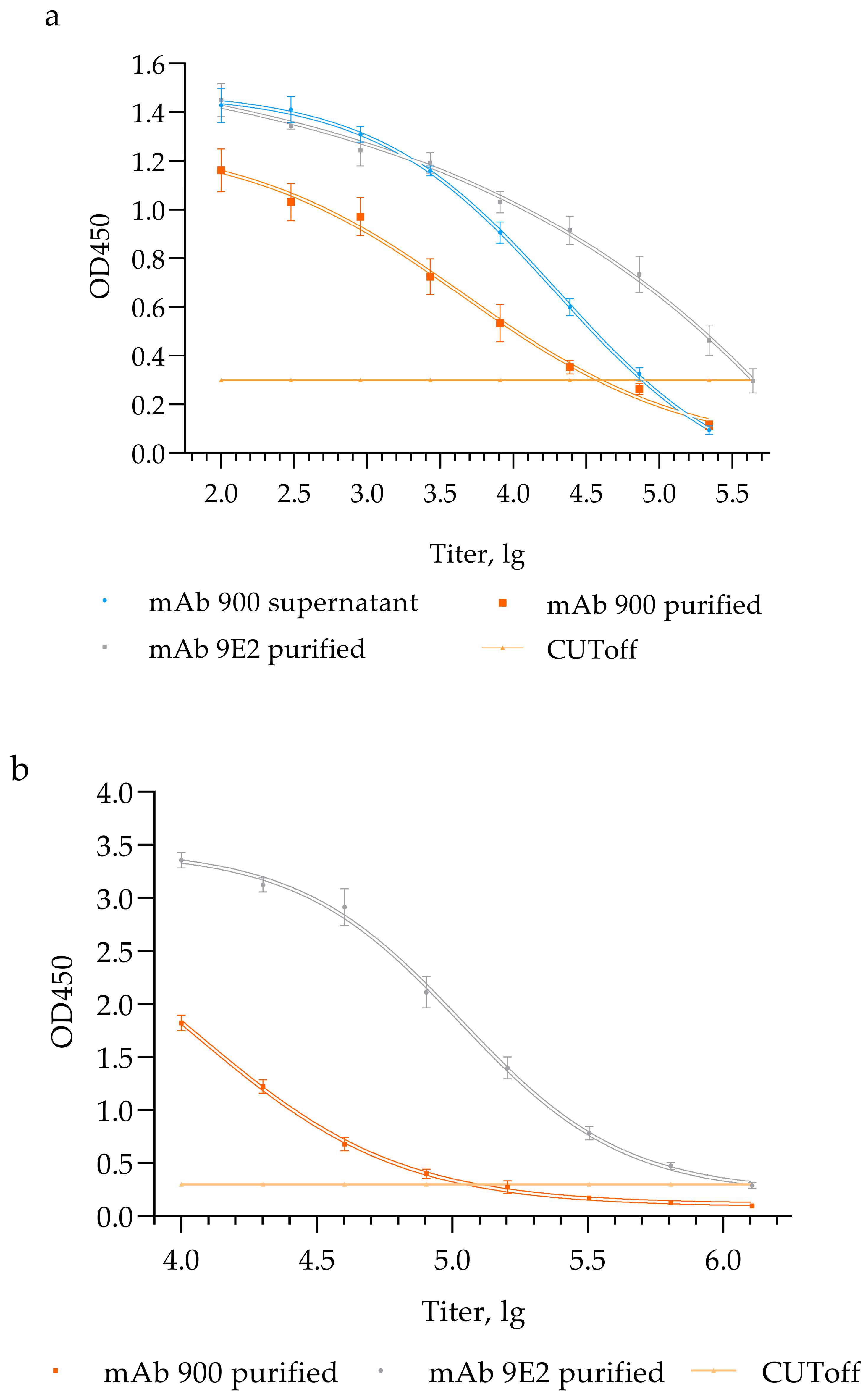 2.3. Functional Activity of mAb 900 in Enzyme-Linked Immunosorbent Assay (ELISA)