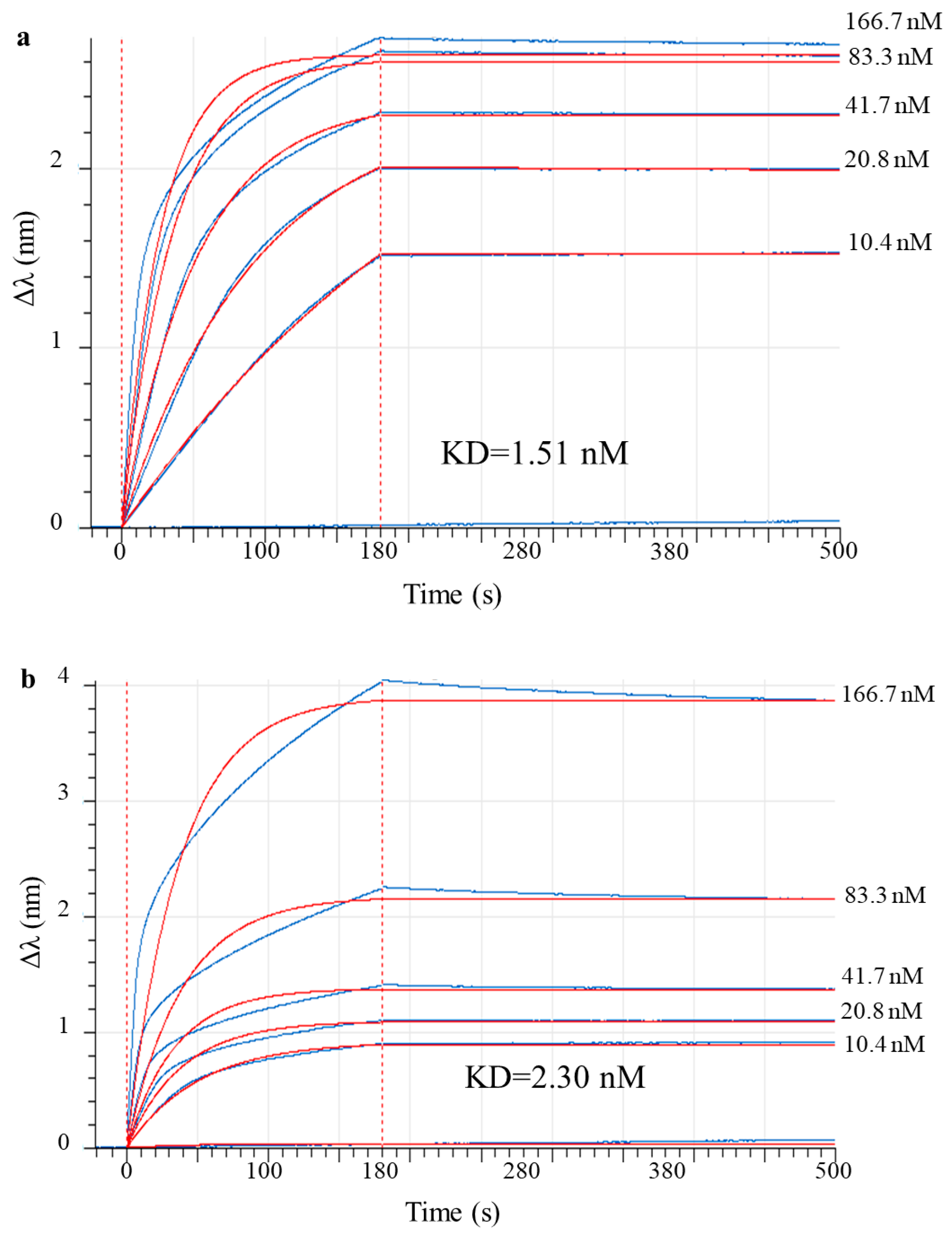Figure 4. Sensorgram curves for recombinant analog of D III of WNV glycoprotein E binding of increasing concentrations of murine mAb 9E2 and chimeric mAb 900 in a biolayer interferometry (BLI)-kinetic assay. The blue line indicates the values obtained from the interaction of recombinant antigen with mAb 9E2 and mAb 900 at different concentrations (166.7 nM, 83.3 nM, 41.7 nM, 20.8 nM, 10.4 nM); the red line represents the global fit of the 1:1 binding model, approximating the experimental data. (a) Sensorgram curves for DIII binding of mAb 9E2; (b) Sensorgram curves for DIII binding of mAb 900.