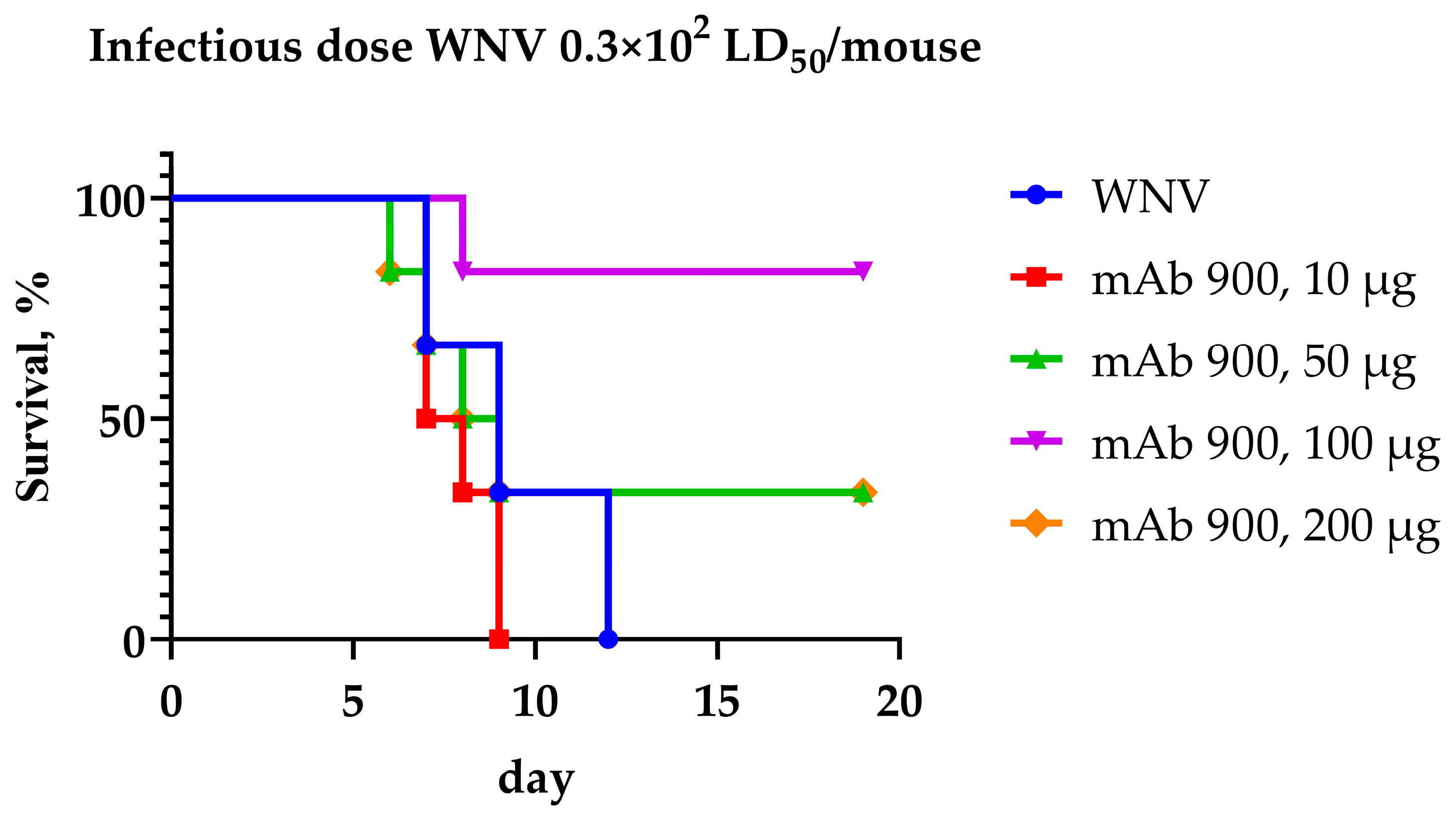 The results assessing the protective activity of the recombinant chimeric mAb 900 against infection with the WNV strain LEIV-Vlg99-27889-human (0.3 × 102 LD50 per mouse) are presented in Table 4 and Figure 5. The experiment was conducted using a BALB/c weanling mouse model, with mAb 900 administered 6 h post-infection.