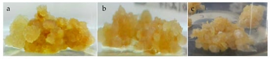 Three lines of P. carabiasiae calluses were established and grown under constant light, photoperiod, and in darkness. The most friable calluses were observed in the line maintained in constant light and with yellow pigmentation (Figure 2a), followed by calluses grown in darkness (Figure 2c), highlighting their low pigmentation.