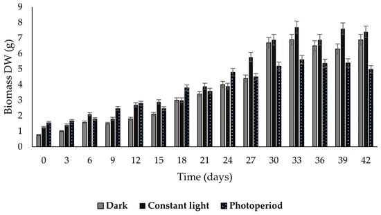The three callus lines showed accelerated growth until reaching the maximum biomass yield on day 33, with values of 7.7, 6.9, and 5.6 g dry weight (DW) for calluses grown in constant light, darkness, and photoperiod, respectively (Figure 3). Subsequently, growth was maintained until the 42 days of cultivation.