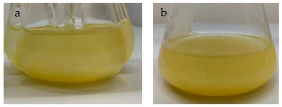 Plukenetia carabiasiae cell suspension cultures in B5 (2,4-D: CIN) medium, (a) in flasks with side baffles (establishment) and (b) after 30 days of growth.