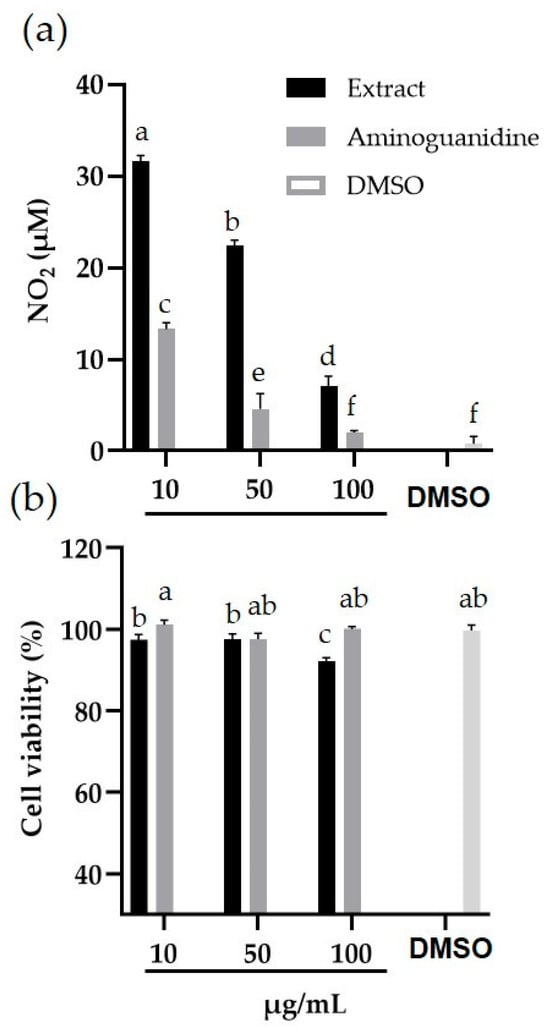 Inhibition of (a) nitric oxide (NO) production and (b) viability of the murine macrophage cell line RAW 264.7 induced by E. coli lipopolysaccharide, after treatment with aminoguanidine and Plukenetia carabiasiae methanolic extract (10, 50, and 100 μg/mL), or solvent dimethyl sulfoxide (DMSO). Mean values (n = 3–6) with different letters on each bar are statistically different (p < 0.05), according to Tukey’s test.