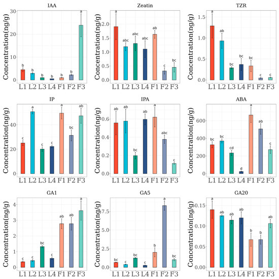 Using HPLC-MS/MS, we quantified the concentrations of several endogenous hormones (Figure 1). IAA (Indole-3-Acetic Acid), a type of auxin, exhibits an increasing trend in concentration as leaves develop, though differences between consecutive stages are not statistically significant. During the late stage of floral organ development, its concentration peaks at approximately 24 ng/g, significantly higher than at other stages. Except for the F3 stage, there is no significant difference in IAA levels between floral organs and leaves. This pattern may be attributed to changes in auxin biosynthesis, transport, or degradation during specific developmental stages.