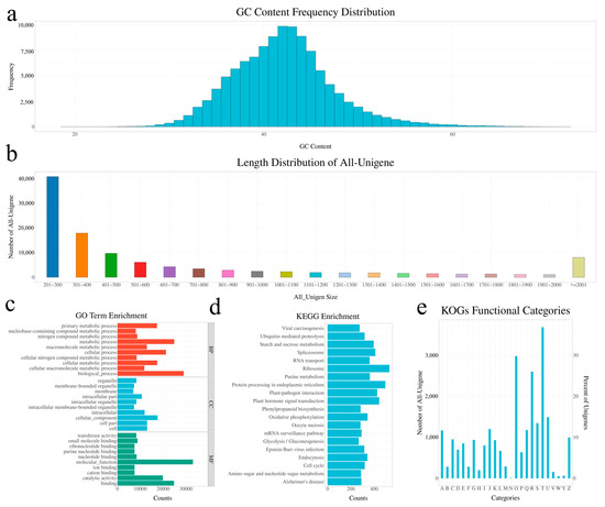 Transcriptome sequencing and annotation results of P. chekiangensis. (a) GC content and distribution: The GC content distribution of the assembled unigenes, indicating the overall sequence composition. The majority of unigenes show a balanced GC content, ranging from 40 to 50%. (b) Length distribution of all unigenes: the unigene length distribution, with a significant number of unigenes in the 300–1000 bp range, reflecting the diversity of gene sizes in the transcriptome. (c) GO enrichment analysis: Gene Ontology (GO) term categorization, highlighting enriched functions in biological processes, molecular functions, and cellular components. (d) KEGG annotation analysis: KEGG pathway mapping showing the involvement of unigenes in various metabolic and signaling pathways. (e) KOG annotation results: KOG functional classification revealing key roles in signal transduction, protein modification, and general cellular functions.