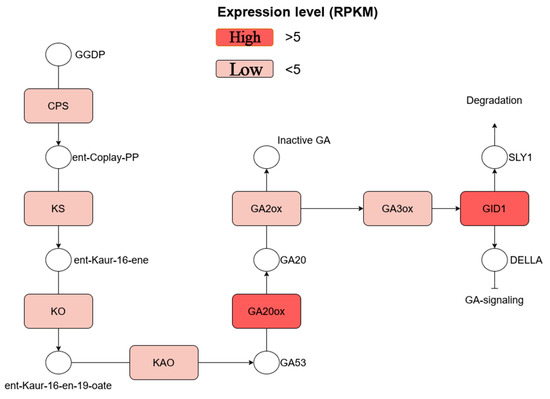 Genes involved in the GA biosynthesis pathway in P. chekiangensis and their RPKM values.