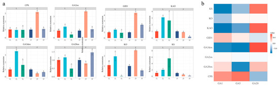 qPCR of genes in the gibberellin biosynthesis pathway and their correlation with gibberellin. (a) Relative expression levels of genes in the gibberellin biosynthesis pathway. p values were calculated using Tukey’s HSD test, and different letters indicate a p value < 0.01. (b) Correlation analysis between genes involved in the GA biosynthesis pathway and GA content.