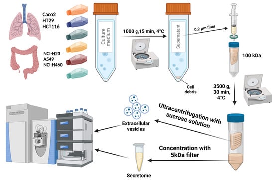 Experimental design of proteomic profiling of extracellular vesicles (EVs) and secretome samples derived from the model cell lines (Caco-2, HT29, HCT116 and A549, NCl-H23, NCl-H460). One initial volume of FBS-free cultural medium was used for obtaining EVs and secretome samples.