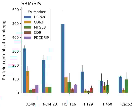 The result of measuring extracellular vesicle (EV) markers (HSPA8, CD63, MFGE8, CD9, and PDCD6IP) with the method of targeted mass spectrometry using isotope-labeled peptide standards (SRM/SIS) in samples of EVs isolated from the culture media of CRC cell lines (HCT116, HT29, and Caco2) and LC cell lines (A549, NCI-H23, and H460). The EVs were isolated in three replicates for each cell line studied, SRM/SIS measurements were performed in doubles for each EV sample.