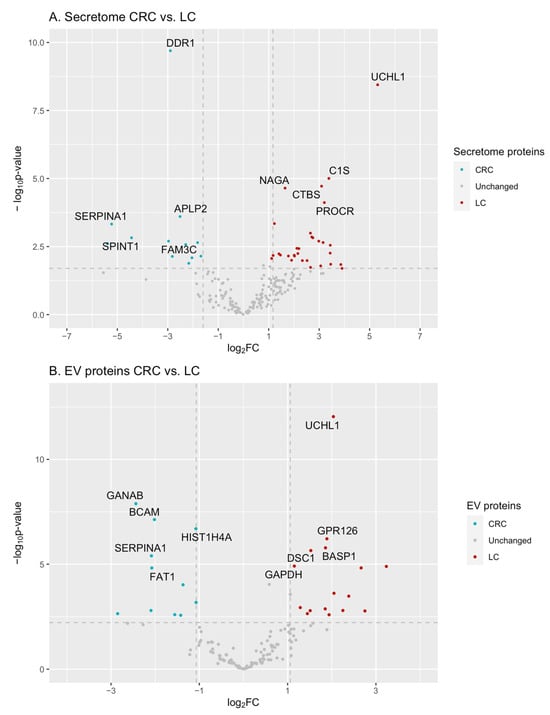 Volcano plots of proteins detected in the secretome (A) and EV (B) samples of LC and CRC cell lines. Proteins with significantly higher levels (FC > 2, FDR < 0.05) in the secretome samples of CRC cell lines (Caco-2, HT29, and HCT116) (left) and LC cell lines (A549, NCI-H23, and NCI-H460) (right). The names of 10 proteins with the most significant differences in levels between CRC- and LC-derived samples are shown.