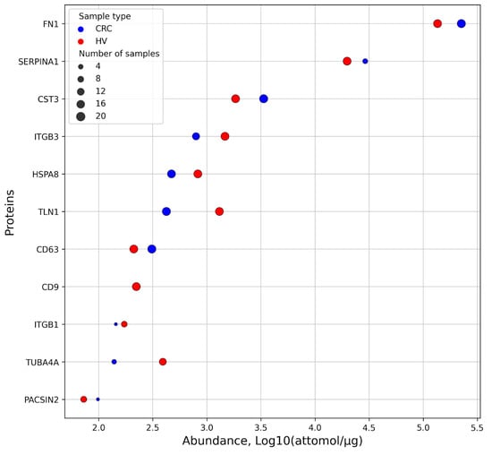 Quantitative data on 11 proteins detected in EV samples isolated from the blood plasma of patients with CRC and healthy volunteers (HVs). Average values expressed as attomole/mg total protein were log-transformed to base 10. Proteins measured in EV samples obtained from blood of patients with CRC and HVs are shown as blue and red dots, respectively. The size of the markers is proportional to the number of samples in which the proteins were detected.