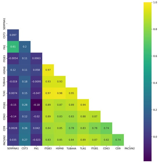 Figure 5 shows that the highest correlation (r > 0.9) was observed for HSPA8, TUBA4A, and ITGB3 proteins. A moderate correlation (r > 0.7) was found for HSPA8, TUBA4A ITGB3, CD63, and CD9 proteins. The FN1, SERPINA1, and CST3 levels were inversely correlated with the abundance of other proteins found in the plasma-derived EVs.