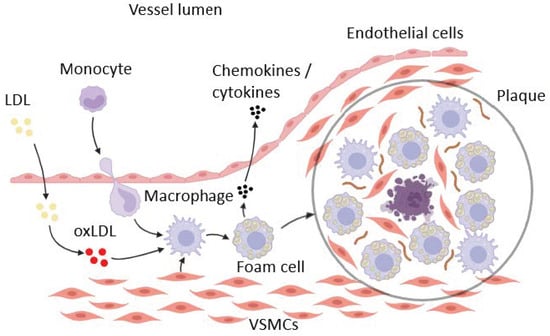 Atherosclerosis is a pathological process involved in many cardiovascular diseases including ischemic heart disease, cerebrovascular disease, atherosclerosis of the aorta, peripheral vascular disease, myocardial infarction, heart failure, and stroke, which are summarily the most common causes of global mortality [,,,]. Firstly described as a primarily metabolic disorder, now atherosclerosis is considered a widely studied complex inflammatory process (Figure 1) [,,,,,,,,,,,,,,,,]. Despite the well-known leading role of low-density lipoproteins (LDLs) [], triggers of atherosclerosis are being discussed. Impairment of the vascular wall of the arteries seems to be one of the most early stages of the pathology [,,]. Subtle and focal physical or chemical injury is mostly associated with age-related processes, which result in weakened contacts between endothelial cells and facilitate the transport of LDL particles through the endothelial wall into the intima with subsequent forming of “lipid bands” [,]. Activated endothelial cells play the role of the primary source of cytokines, chemokines, and adhesion molecules, such as MCP-1, ICAM-1, VCAM-1, E-selectin, and P-selectin, facilitating the migration of leukocytes into the vessel intima [,]. Increased activity of myeloperoxidase, lipoxygenase, cyclooxygenase, cytochrome P450, NADPH oxidases (NOXs), xanthine oxidase, and the reactive oxygen species (ROS)-producing mitochondrial electron transport chain (ETC) with decreasing antioxidant capacity lead to LDL oxidation [,]. Engulfment of oxidized LDL particles (oxLDLs) by monocytes and polarized macrophages as well as by activated and transdifferentiated vascular smooth muscle cells (VSMCs) and, to a lesser extent, by other cell types leads to the formation of foam cells becoming a secondary source of massive cytokine release and a main cellular component of newly formed atherosclerotic plaque [,,]. Size and stability of the plaque are the critical parameters of developing pathology. A large lipid core with a high level of necrosis and incomplete apoptosis or other programmed cell death pathways as well as a thin fibrous sheath, ongoing inflammation, and increased degradation of the extracellular matrix by metalloproteinases are the signs of vulnerable plaques, which lead to vessel thrombosis after rupture [,,,]. In about 30% of cases, vulnerable plaques can undergo erosion-like degradation [,,]. Stable-growing plaques containing insoluble fibers based on type I collagen significantly impair blood circulation, leading to arterial narrowing and tissue ischemia [,,].