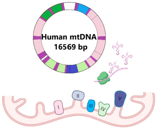 The biology of mitochondria significantly differs from other cell structures due to the presence of its own genome: mtDNA []. Human mtDNA (Figure 3) is a double-strand cyclic molecule with a size of 16,569 bp that contains 37 genes []. Two of them encode 12S and 16S rRNA, 22—tRNAs, and 13—polypeptides of mitochondrial ETC (seven subunits of NADH dehydrogenase complex (complex I), one subunit of coenzyme Q: cytochrome c oxidoreductase (complex III), three subunits of cytochrome c oxidase (complex IV), and two subunits of F1-F0 ATP synthase (complex V)) [,,]. Despite the small number of encoding products compared to the whole mitochondrial proteome, which is more than 1500 [], mtDNA stability is extremely important for mitochondrial function.