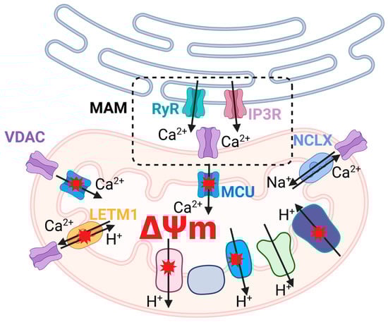 mtDNA-associated mitochondrial dysfunction and disturbances of intracellular calcium homeostasis. Mitochondria calcium buffering is primarily supported by MCU transportation of Ca2+ into the matrix due to the electrochemical gradient that is mostly formed by the mitochondrial membrane potential (ΔΨm). Efflux of Ca2+ from the matrix is provided by the mitochondrial Na+-Ca2+ exchanger (NCLX) and leucine zipper–EF hand-containing transmembrane protein 1 (LETM1). ETC dysfunction is frequently linked with ΔΨm decrease, which leads to alterations in calcium buffering capability. Complex V dysfunction reduces the energy support role of calcium transport processes. The close relationship of mitochondria with ER (Ryanodine (RyR) and inositol trisphosphate (IP3R) receptors) worsens ER stress due to a decrease in MAM formation.