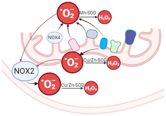 Recent studies show direct communication between mitochondria and NOX-derived ROS. There is information about the localization of NOXs (mostly NOX4) on mitochondrial membranes [,]. But, more importantly, NOXs (primarily NOX2 []) and mitochondria are characterized by a cross-talk mediated by ROS [,,,]. Increasing mitochondria-stimulating NOX2 activity in SOD-deficient models shows the leading role of , not H2O2, in the process []. Dysfunctional ETC leads to increased production of , which may be released into the cytosol through inner membrane anion channels or mPTP [] (Figure 6).