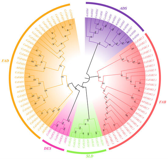 In plants, fatty acids are classified into saturated fatty acids and unsaturated fatty acids, with polyunsaturated fatty acids being dominant. Their synthesis involves complex metabolic pathways catalyzed by desaturases [14]. These desaturases can be further subdivided into two major categories: soluble proteases and membrane-bound proteases. The five major subfamilies of desaturases are acyl-CoA-desaturase (ADS), sphingolipid Δ-4 desaturase (DES), Δ-9 stearoyl-ACP desaturase (SAD), acyl-lipid desaturase (FAD), and sphingolipid Δ-8 desaturase (SLD) [15].