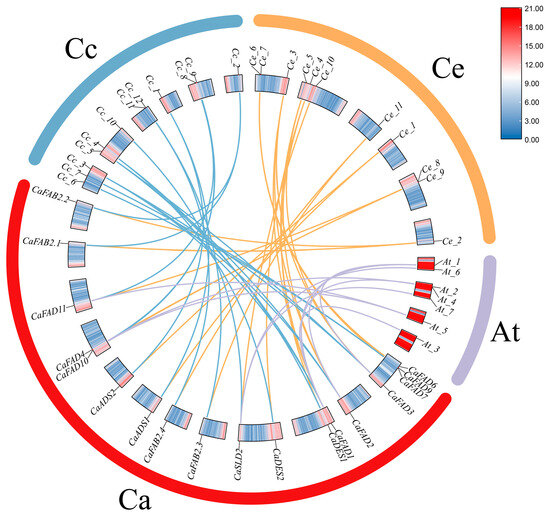 Interestingly, one CaFAD gene was found to have collinear relationships with multiple genes in other species. Conversely, single genes in other species exhibited collinearity with multiple CaFAD genes in C. arabica. This suggests that gene duplication and divergence events have occurred extensively, contributing to the functional diversification of the FAD gene family.