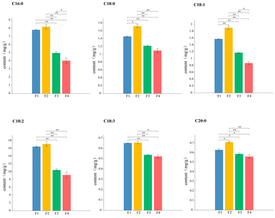 Determination of fatty acid contents in C. arabica seeds at different fruit development stages. F1, F2, F3, and F4 indicate 30, 80, 130, and 180 days post-flowering; * and ** indicate significant differences at p ≤ 0.05 and p ≤ 0.01.
