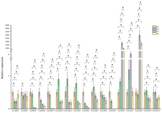 Validation by qRT-PCR. The expression levels of 17 CaFAD family genes during the four developmental stages—30 (F1), 80 (F2), 130 (F3), and 180 (F4) days post-flowering. The 2−ΔΔCt data for the first developmental stage samples were used for normalizing the expression data. Results represent the mean of three biological replicates and two technical replicates (mean ± SD, n = 6). * indicates significant differences at p ≤ 0.05.