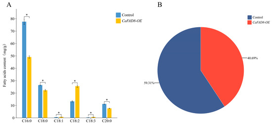 To explore the functional role of CaFAD8 in fatty acid metabolism, the fatty acid contents of wild-type A. thaliana and CaFAD8-OE A. thaliana were measured (Figure 6A). It was found that the fatty acid content of the CaFAD8-OE transgenic plants was lower than that of the wild-type seeds. A comparative analysis of six major fatty acids highlighted significant changes in the composition between wild-type and transgenic plants (Figure 6A). Saturated fatty acids, i.e., stearic acid (C18:0), palmitic acid (C16:0), and arachidic acid (C20:0), were significantly reduced in CaFAD8-OE plants compared to wild-type (p ≤ 0.05). While unsaturated fatty acids were markedly elevated in transgenic plants (p ≤ 0.05). The pie chart represents the relative proportion of total fatty acids in wild-type and CaFAD8-OE plants, with CaFAD8-OE plants exhibiting higher total fatty acid content (59.31%) compared to wild-type plants (40.69%) (Figure 6B). Thus, the total fatty acid content in CaFAD8-OE was 18% less than the wild type. These findings demonstrate that CaFAD8 enhances the degree of fatty acid desaturation, which is essential for membrane fluidity and aroma precursor biosynthesis in seeds.