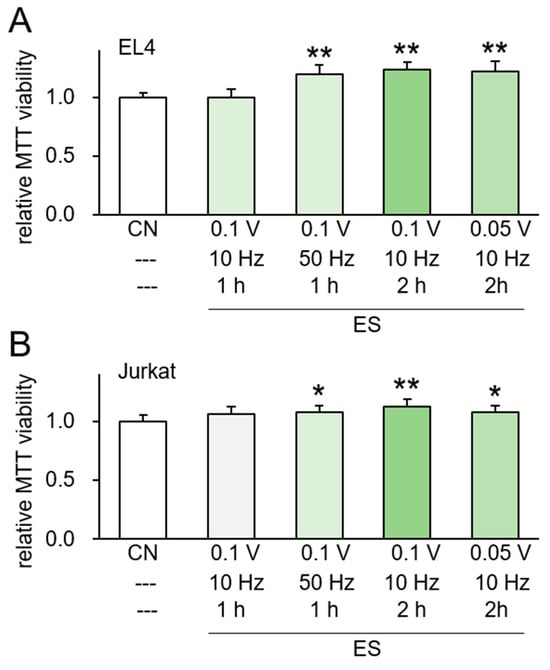 ES effects for EL4 and Jurkat cells directly. CN = control, and CM = conditioned medium. Data are presented as mean ± SD (n = 6 independent experiments). Statistical analysis was performed using one-way ANOVA followed by Bonferroni correction. The asterisks indicate statistical significance compared to the control group. The single asterisk (*) indicates p < 0.05, and the double asterisks (**) indicate p < 0.01. ES was applied with 0.1 or 0.05 V at 10 or 50 Hz for 1 or 2 h, and the CM was harvested 24 h later. (A,B) MTT-based viability of EL4 and Jurkat cells in response to ES-treated.