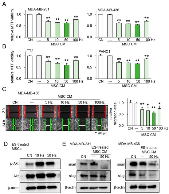 Evaluation of ES-treated MSC CM. CN = control, and CM = conditioned medium. Data are presented as mean ± SD (n = 6 independent experiments). Statistical analysis was performed using one-way ANOVA followed by Bonferroni correction. The asterisks indicate statistical significance compared to the control group. The single asterisk (*) indicates p < 0.05, and the double asterisks (**) indicate p < 0.01. ES was applied with 0.1 V at 5, 10, 50, and 100 Hz for 1 h, and the CM was harvested 24 h later. (A) Reduction in MTT-based viability of MDA-MB-231 and MDA-MB-436 breast cancer cells in response to ES-treated MSC CM. (B) Reduction in MTT-based viability of TT2 osteosarcoma cells and PANC1 pancreatic cancer cells in response to ES-treated MSC CM. (C) Suppression of scratch-based motility of MDA-MB-436 cells in response to ES-treated MSC CM. (D) Elevation in the level of p-Akt in ES-treated MSCs at 10 and 50 Hz for 1 h. (E) Decreased level of the EMT-related markers, Snail and Slug, in the two breast cancer cell lines (MDA-MB-231, MDA-MB-436), which were cultured in ES-treated MSC CM.