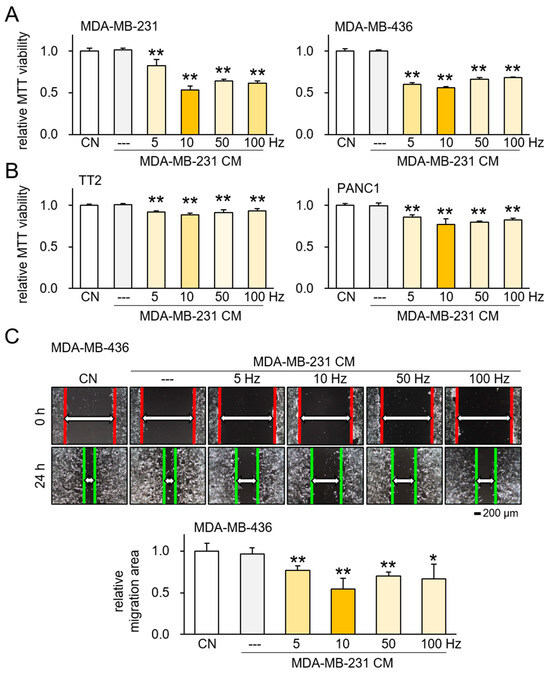 Tumor-suppressive effects of ES-treated MDA-MB-436 CM. ES = electrical stimulation, CN = control, and CM = conditioned medium. Data are presented as mean ± SD (n = 6 independent experiments). Statistical analysis was performed using one-way ANOVA followed by Bonferroni correction. The asterisks indicate statistical significance compared to the control group. The single asterisk (*) indicates p < 0.05, and the double asterisks (**) indicate p < 0.01. ES was applied with 0.1 V at 5, 10, 50, and 100 Hz for 1 h, and the CM was harvested 24 h later. (A) Reduction in MTT-based viability of MDA-MB-231 and MDA-MB-436 cells by ES-treated MDA-MB-231 CM. (B) Reduction in MTT-based viability of TT2 and PANC1 cells by ES-treated MDA-MB-231 CM. (C) Reduction in scratch-based motility of MDA-MB-436 cells by ES-treated MDA-MB-231 CM.