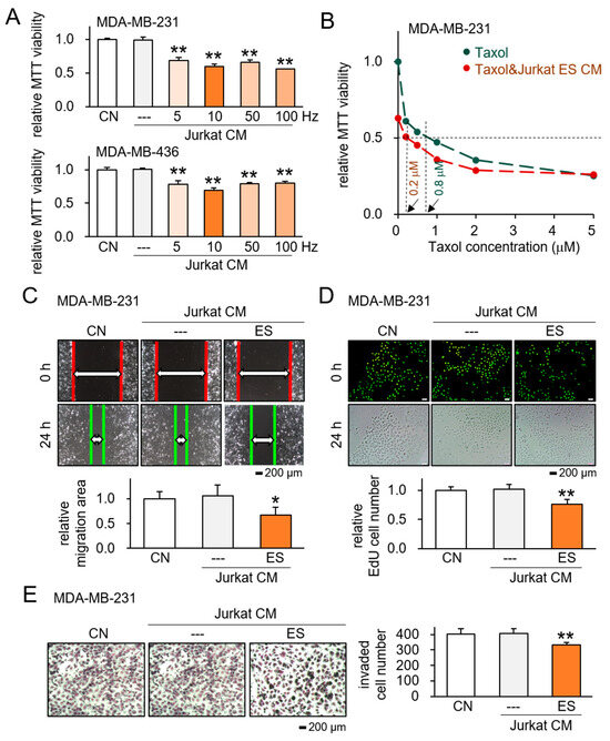 Tumor-suppressive action of ES-treated Jurkat lymphocyte-derived CM. CN = control, and CM = conditioned medium. Data are presented as mean ± SD (n = 6 independent experiments). Statistical analysis was performed using one-way ANOVA followed by Bonferroni correction. The asterisks indicate statistical significance compared to the control group. The single asterisk (*) indicates p < 0.05, and the double asterisks (**) indicate p < 0.01. ES was applied with 0.1 V at 5, 10, 50, and 100 Hz for 1 h, and the CM was harvested 24 h later. (A) Reduction in MTT-based viability of MDA-MB-231 and MDA-MB-436 breast cancer cells by ES-treated Jurkat CM. (B) Additive anti-tumor effects of ES-treated Jurkat derived CM with Taxol. (C) Suppression of scratch-based motility of MDA-MB-231 cells in response to ES-treated Jurkat CM. (D,E) Inhibitory effects of ES-treated Jurkat CM on EdU-based proliferation and transwell invasion of MDA-MB-231 cells.
