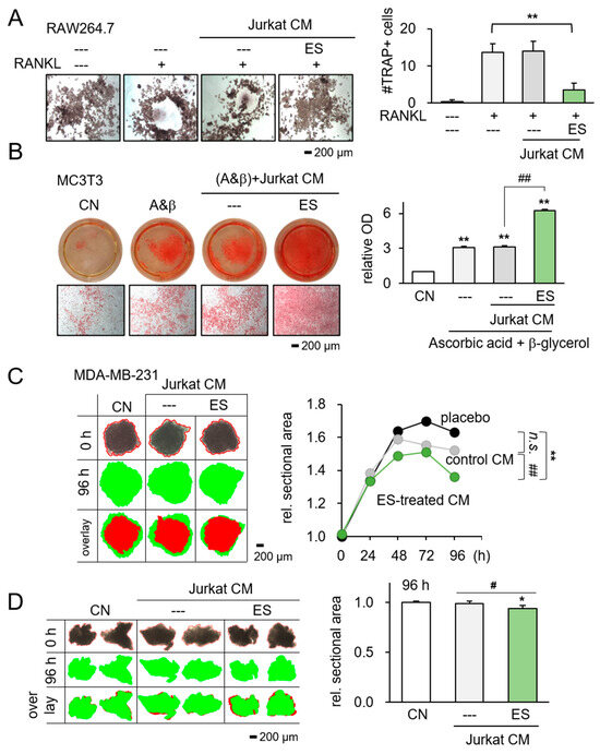 Inhibitory effects of ES-treated Jurkat lymphocyte-derived CM on RAW264.7 osteoclast and breast cancer tissue fragment. CN = control, and CM = conditioned medium, n.s. = nonsense. Data are presented as mean ± SD (n = 6 independent experiments). Statistical analysis was performed using one-way ANOVA followed by Bonferroni correction. The asterisks indicate statistical significance compared to the control group. The single asterisk (*) indicates p < 0.05, and the double asterisks (**) indicate p < 0.01. Using connecting lines to indicate group comparisons. The single pound sign (#) indicates p < 0.05, and the double pound signs (##) indicate p < 0.01. ES was applied with 0.1 V at 10 Hz for 1 h, and the CM was harvested 24 h later. (A) Significant reduction in multi-nucleated RANKL-stimulated osteoclasts in response to ES-treated Jurkat-derived CM. (B) Elevation in Alizarin Red staining of MC3T3 osteoblasts by the administration of ES-treated Jurkat CM. (C) 3D tumor spheroids in response to ES-treated Jurkat CM and every 24 h observations and records. (D) Reduction in breast cancer tissue fragment size in 96 h in response to ES-treated Jurkat-derived CM (n = 6). The red image indicates tissue fragments at 0 h, while the green image indicates them at 96 h.
