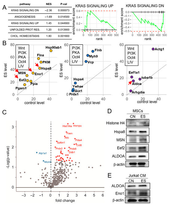 Mass spectrometry-based proteomics analysis of the ES-treated CM. CN = control, ES = electrical stimulation, and CM = conditioned medium. ES was applied with 0.1 V at 10, Hz for 1 h, and the CM was harvested 24 h later from Jurkat cells and MSCs. For the proteins directed by the red arrow, their elevated level by ES treatment was validated by Western blot analysis. (A) Enrichment of K-Ras signaling in ES-treated Jurkart cell-derived CM. The data shows the pathways with p < 0.05 in gene set enrichment analysis. Enrichment plots of gene sets of upregulation by K-Ras activation (KRAS SIGNALING UP) and downregulation by K-Ras activation (KRAS SIGNALING DN) are shown. (B) Nine enriched proteins (Hsp90ab1, Flna, PKM, Hsp8, Eno1, MSN, Eef2, Ppia, and Pgam1) by 6 iTS generation procedures (the activation of Wnt signaling, PI3K signaling, and PKA signaling, the overexpression of Oct4, the application of low-intensity vibration—LIV, and the application of ES), seven proteins (Flnb, Myh9, Vcp, Hspa4, Ywhae, Got1, and Prdx1) and five proteins (Actg1, Eef1a1, Tuba1b, Aldoa, and Arhgdia) by the five independent iTS generating procedures, including ES treatment. (C) Volcano plot, showing the proteins enriched by ES treatment, including Histone H4. (D) Western blot images, showing the elevated levels of Histone H4, Hspa8, MSN, Eef2, and Aldoa in ES-treated MSC-derived CM. (E) Western blot images, showing the elevated levels of Aldoa and Eno1 in ES-treated Jurkat cell-derived CM.