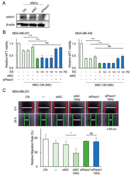 Mechanism of Piezo1 and Wnt Signaling in ES-driven iTS Cell Generation CN = control, and CM = conditioned medium, ns = nonsense. Data are presented as mean ± SD (n = 6 independent experiments). Statistical analysis was performed using one-way ANOVA followed by Bonferroni correction. Using connecting lines to indicate group comparisons. The single asterisk (*) indicates p < 0.05, and the triple asterisks (***) indicate p < 0.001. ES was applied with 0.1 V at 5, 10, 50, and 100 Hz for 1 h, and the CM was harvested 24 h later. (A) Decreased levels of Piezo1 proteins in MSCs by the transfection of si-Piezo1 plasmids. (B) Reduction in MTT-based viability of MDA-MB-231 and MDA-MB-436 breast cancer cells in response to ES-treated MSC CM. While knockdown of Piezo1 in MSCs significantly weakened the inhibitory effect of ES-generated conditioned medium (CM) on the viability of breast cancer cells MDA-MB-231 and MDA-MB-436. (C) Suppression of scratch-based motility of MDA-MB-436 cells in response to ES-treated MSC CM.