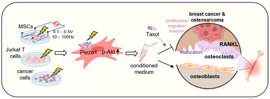 Proposed mechanism of the anti-tumor action of ES effect. The application of ES to MSCs, T cells, and tumor cells triggers the activation of the mechanosensitive ion channel Piezo1 and PI3K/Akt signaling, which plays a pivotal role in cellular responses to ES. The activation leads to the secretion of tumor-suppressive proteins, including Histone H4, enriched in the CM. Together with Taxol, the CM exhibits anti-tumor effects on breast cancer cells and osteosarcoma cells by suppressing cancer cell migration, proliferation, and invasion while inhibiting RANKL-stimulated osteoclast differentiation and enhancing osteoblast mineralization, thereby counteracting bone metastasis.