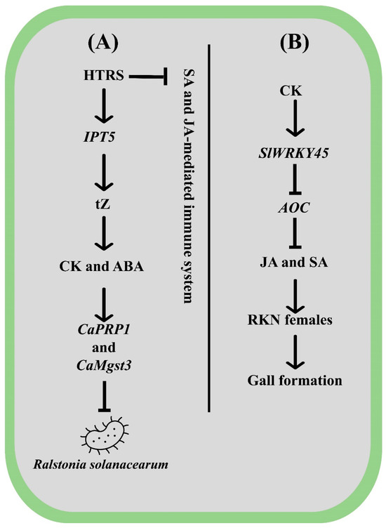 - Yang, S.; Cai, W.; Shen, L.; Wu, R.; Cao, J.; Tang, W.; Lu, Q.; Huang, Y.; Guan, D.; He, S. Solanaceous plants switch to cytokinin-mediated immunity against Ralstonia solanacearum under high temperature and high humidity. Plant Cell Environ. 2022, 45, 459–478. [Google Scholar] [CrossRef] [PubMed]