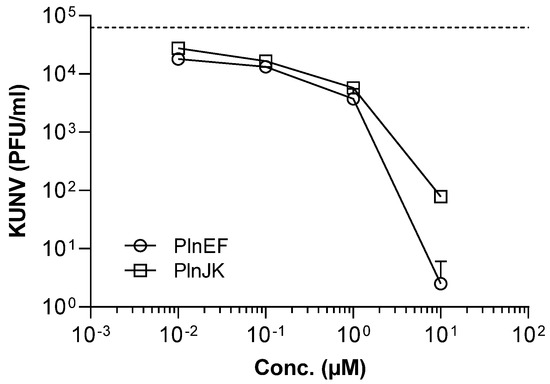 Antiviral activity of the two-peptide plantaricins EF and JK against KUNV. The flavivirus Kunjin (KUNV, 1 × 105) was suspended in a cell culture medium (DMEM) and either left untreated or exposed to different concentrations of PlnEF, or PlnJK for 1 h. The suspensions were then added to a semi-confluent layer of Vero cells for 1 h, followed by the addition of overlay media and incubation for 3 days. Viral load was quantified by performing the plaque assay. The dotted line shows the number of KUNV (PFU/mL) in the untreated positive control. Results are presented as the mean with standard deviation of two independent experiments, each in duplicate. The two-peptide bacteriocins PlnEF and PlnJK are efficient against KUNV and can substantially reduce the viral load.