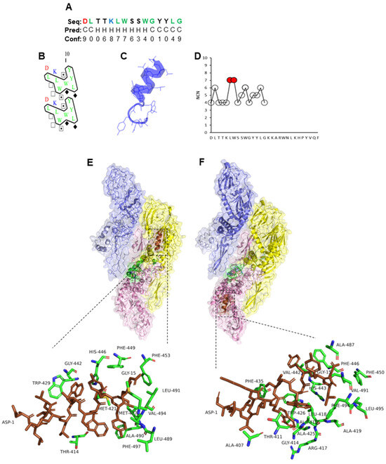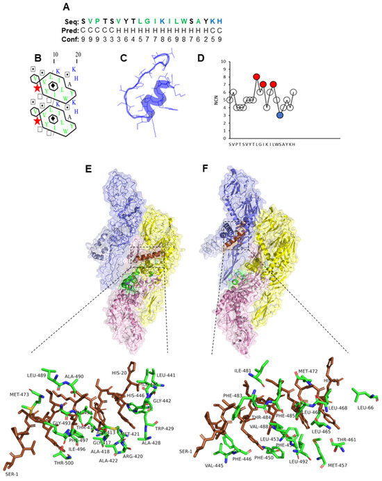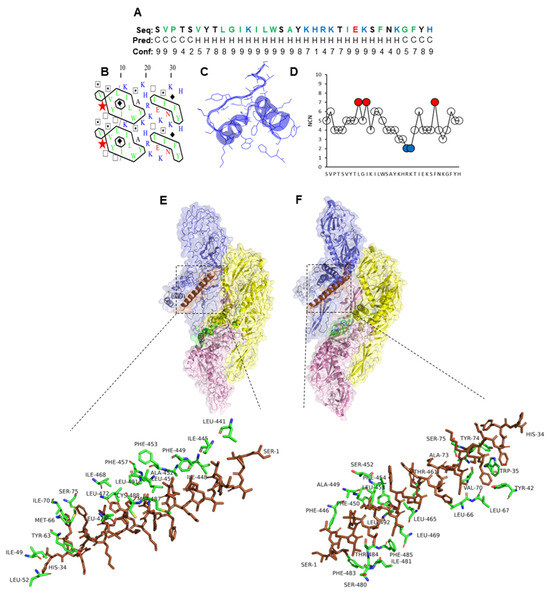 Characteristics of selected peptides were determined using the RPBS Wed Portal (https://bioserv.rpbs.univ-paris-diderot.fr/index.html, accessed on 25 May 2023). The secondary structures of the peptides were determined by predicting α-helices and coils, hydrophobic cluster analysis, and peptide folding, using the psipred [58], HCA [59], and PEP-FOLD3 [60] tools, respectively. Furthermore, the number of contact neighbors (NCNs), with most interacting residues (MIRs) and least interacting residues (LIRs), was defined based on the thresholds >6 and ≤3, respectively [61].