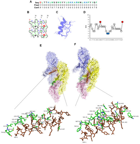 In contrast, the N-terminal region of full-length PLNC8 α (29 amino acid peptide) was predicted to form an α-helix, while the C-terminal region formed random coils (Figure 3A–C). The hydrophobic amino acids tryptophan (W) and phenylalanine (F) were identified as MIRs and are most probably important contributors to peptide stability and folding, while two repeated lysine (K) were least interacting residues (LIRs), suggesting an important function in peptide activity (Figure 3D). PLNC8 α interacted mainly with the stems and transmembrane regions of ZIKV (Figure 3E) and KUNV (Figure 3F).