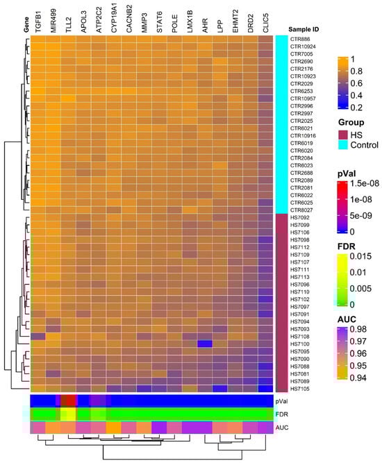 The heatmap generated from our analysis delineates two distinct clusters of genes with differential methylation profiles, one representing individuals with HS and another healthy controls. This visualization is depicted in Figure 1 and underscores the substantial methylation differences between the two groups, reflecting the pathophysiological alterations in HS patients compared to unaffected individuals. The genes selected for this heatmap all showed high discriminative power, with AUC values > 0.9 and FDR p-values ≤ 0.05, confirming their relevance in the methylation patterns associated with HS. The hierarchical clustering used in this analysis further supports the robustness of these methylation markers in distinguishing between affected and non-affected individuals.