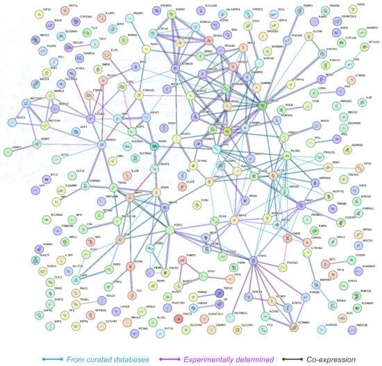 Illustration of the protein–protein interaction network derived from STRING analysis, showing 249 interconnected genes with significant biological coherence, as indicated by a PPI enrichment p-value of <1.0 × 10−16. Nodes represent genes, which are color-coded to denote the source of interaction data, with lines reflecting connectivity.