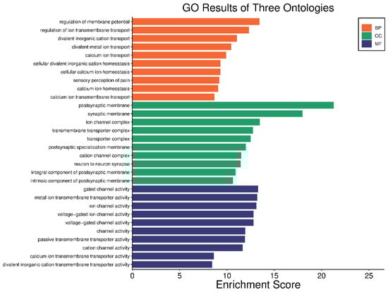 In our comprehensive gene ontology (GO) analysis, we identified significant enrichments across 688 biological processes (BP) terms, 64 cellular components (CC) terms, and 70 molecular functions (MF) terms, all with adjusted p-values < 0.05. For clarity and focus, the top ten teams from each category are visually represented in Figure 4. In the BP category, terms such as “regulation of membrane potential” and “regulation of ion transmembrane transport” were prominent, highlighting the importance of ion transport and membrane potential regulation in the pathophysiology of HS. Similarly, CC terms like “postsynaptic membrane” and “synaptic membrane” suggest alterations in synaptic structures that could play a critical role in the disease. In the MF category, terms such as “ion channel activity” and “voltage-gated ion channel activity” point to disruptions in ion channel functions, which are crucial for proper cell signaling and function. The complete list of enriched GO terms is available in Supplementary Tables S4–S6, providing a detailed breakdown of these categories.