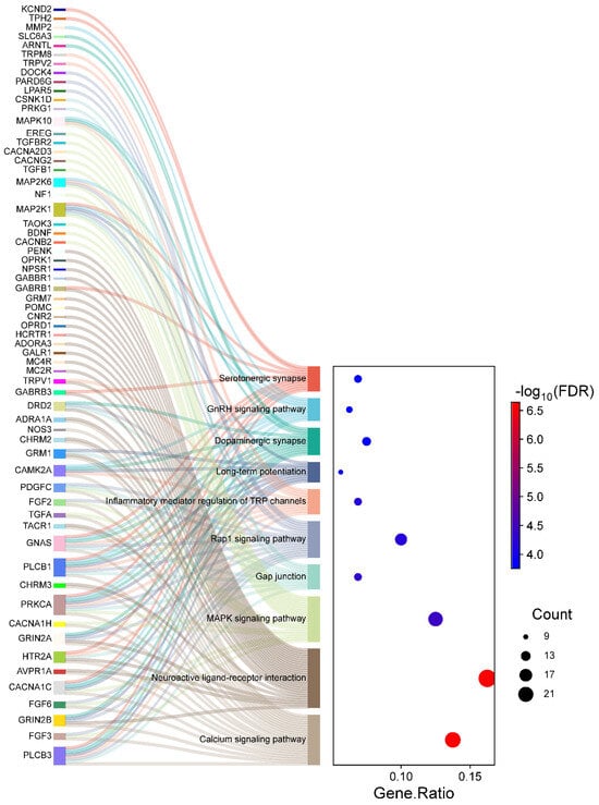 The KEGG pathway analysis identified 76 significantly enriched pathways, again with adjusted p-values < 0.05. For clarity and focus, the top ten pathways are visually represented in Figure 5. The top significantly enriched pathways identified in the KEGG analysis include the Calcium signaling pathway, Glutamatergic synapse, Long-term potentiation, and Circadian entrainment, all of which are integral to neuronal communication and inflammatory responses in HS. Notably, pathways related to neurotransmitter signaling and ion channel regulation, such as Calcium signaling and Glutamatergic synapse, underscore the role of disrupted neuronal processes in chronic pain mechanisms. As depicted in Figure 5, the left section (Sankey plot) visualizes the genes distributed across these enriched pathways, while the right section (dot plot) quantifies gene involvement. Specifically, the gene ratio measures the proportion of genes associated with each pathway relative to the total input genes, allowing for direct comparison of pathway involvement. Larger dots indicate higher gene counts within a pathway, and dot colors represent the statistical significance of the enrichment (FDR). Complete details of all enriched pathways are provided in Supplementary Table S7.