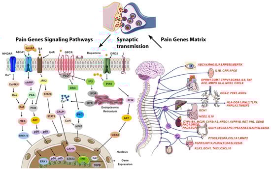 Schematic representation of pain genes and their regulatory pathways showing that most pain transmission is mediated by noxious stimuli via synaptic transmission in the synaptic cleft. Several pain-related genes are commonly expressed across all organs, while different organs utilize specific genes to modulate pain perception through distinct pathways. In the brain, genes like TRPV1 and SCN9A are critical for detecting and modulating pain signals, while COMT influences pain sensitivity through neurotransmitter regulation. Inflammatory pain responses are prominent in all organs, with genes such as IL6, TNF, IL1B, IL10, and IFNL3 playing key roles. Overall, these genes modulate pain through inflammatory responses, nerve sensitivity, and tissue damage across various organs.