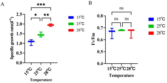 Physiological traits of Skeletonema dohrnii cultured under different temperature conditions. (A): specific growth rate of Skeletonema dohrnii at different temperatures; (B): Fv/Fm of Skeletonema dohrnii at different temperatures; (ns indicates no significance; * indicates p < 0.05; ** indicates p < 0.01; *** indicates p < 0.001).