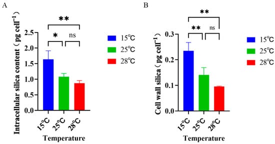 Biosilica content of Skeletonema dohrnii cultured under different temperature conditions. (A): Intracellular silica content of Skeletonema dohrnii at different temperatures; (B): Cell wall silica content of Skeletonema dohrnii at different temperatures (ns indicates non-significant; * indicates p < 0.05; ** indicates p < 0.01).