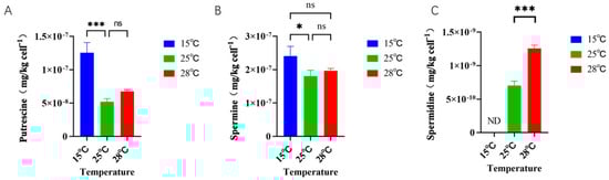 Concentration of polyamines in Skeletonema dohrnii cultured under different temperature conditions. (A): putrescine content of Skeletonema dohrnii at different temperatures; (B): spermine content of Skeletonema dohrnii at different temperatures; (C): spermidine content of Skeletonema dohrnii at different temperatures (ND indicates none detected; ns indicates non-significance; * indicates p < 0.05; *** indicates p < 0.001).