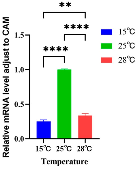 Expression of polyamine oxidase gene in Skeletonema dohrnii cultured at different temperatures (** indicates p < 0.01; **** indicates p < 0.0001).