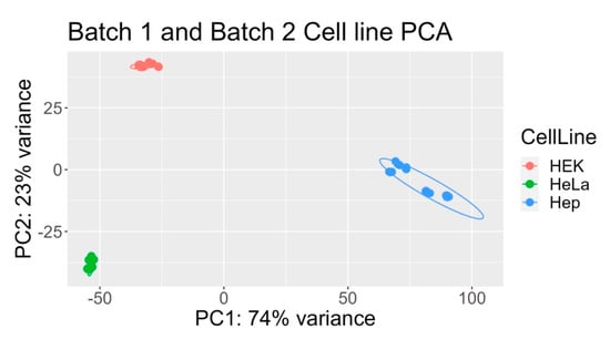 This study characterizes the heat shock response (HSR) in three human cell lines—HeLa, HEK293, and HepG2—by subjecting them to mild heat shock and examining recovery periods of 0 and 8 h. Using principal component analysis (PCA), differential gene expression (DGE), and functional enrichment analyses, we identified conserved and cell-specific genes and pathways activated during and after heat shock. PCA revealed that the primary variance in gene expression was driven by cell type, batch effects, and heat shock recovery time points (Figure 1 and Figure 2). To address the loss of statistical power caused by splitting into two experimental batches, we analyzed the batches individually, effectively gaining a second independent repetition and ensuring that observed trends were consistent across both sets of experiments.