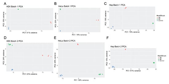 Figure 2 stratifies the analysis by cell line and batch, showing that heat shock conditions (0 h and 8 h recovery) explain most of the variance within each cell line. When analyzing data separated by cell line and batch, PCA revealed that heat shock conditions significantly contributed to gene expression variance (Figure 2). For the HEK293 cell line, heat shock (0 h recovery) explained 81% of the variance in batch 1 (and 65% in batch 2; Figure 2A,D), emphasizing a robust transcriptional response immediately following stress. For HeLa cells, heat shock accounted for 77% of the variance for batch 1, while recovery from heat shock could explain 53% of the variance for batch 2 (Figure 2B,E). HepG2 cells displayed a distinct pattern: most of the variance was explained by recovery from heat shock (8 h), with PC1 capturing 80% of the variance in batch 1 (and 78% in batch 2; Figure 2C,F). The observed pattern highlights cell-line-specific differences in the heat shock response (HSR). These findings collectively establish that cell type, batch, and heat shock are the principal drivers of transcriptomic variance while revealing unique stress response and recovery dynamics across cell lines.